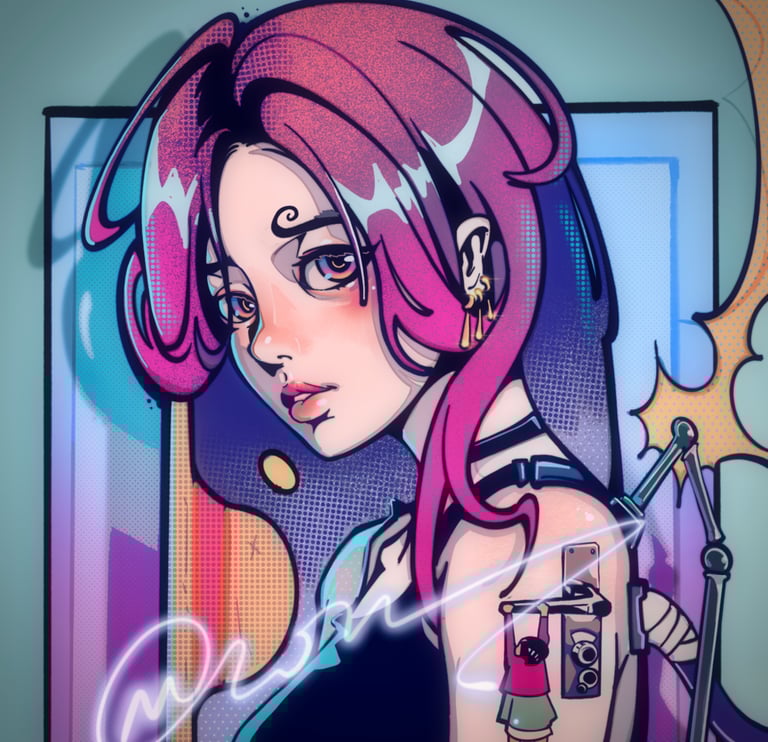 A bold, futuristic portrait style inspired by retro pop culture and cyber aesthetics. Perfect for clients who love vibrant colors, expressive lines, and a touch of sci-fi attitude.